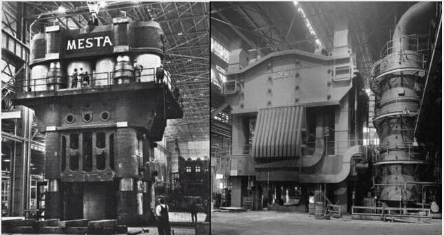 1955年,美国梅斯塔(MESTA)公司为美国铝业公司克利夫兰工厂制造4.5万吨模锻液压机(左),和劳威公司(LOEWY)为Wyman-Gordon公司格拉夫顿锻造厂制造的4.5万吨模锻液压机 。
